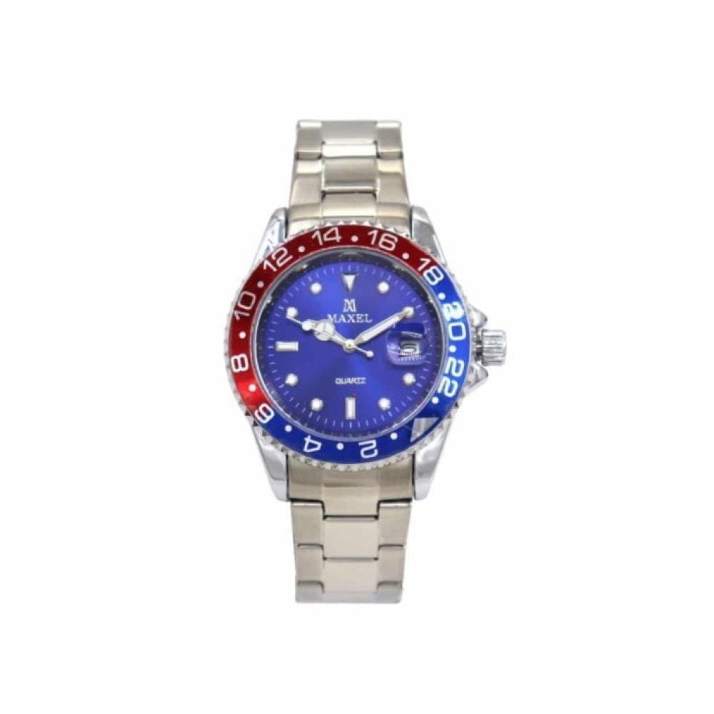 ساعة رجاليه بسير من الستانلس ستيل باللون الفضي ، تتميز الساعة بميناء واسع فريدة وبإطار بارز باللون الاحمر والازرق ، لتتفرد بإطلالتك في كل الأوقات ببساطه وأناقه .