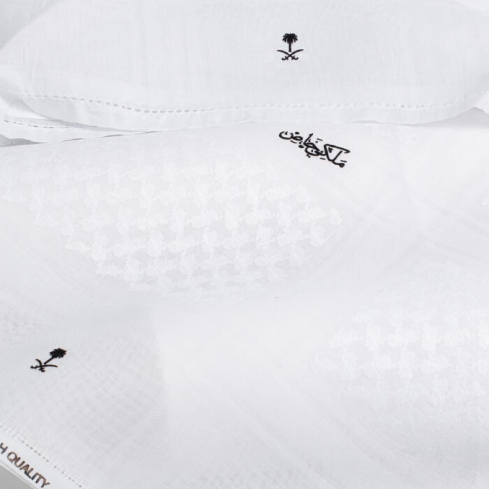 شماغ ابيض ملكي خاص 2025 من الاشمغه المميزة جدا حيث انها تجمع بين الشكل التقليدي الأصيل للشماغ والهوية الخليجية العربية العصرية والموضة الحديثة في شكل مختلف للتصميم والنقشه المصممة على الشماغ