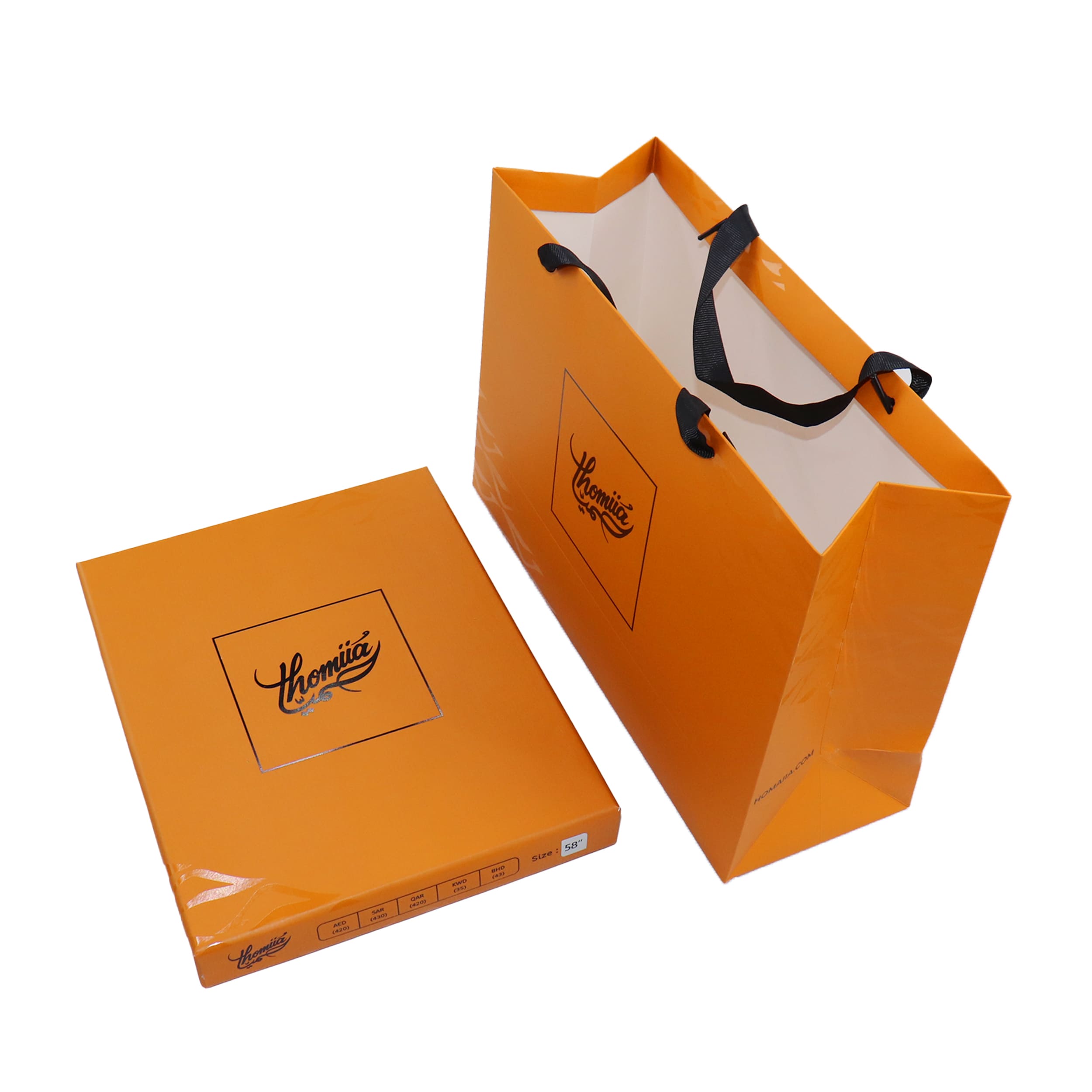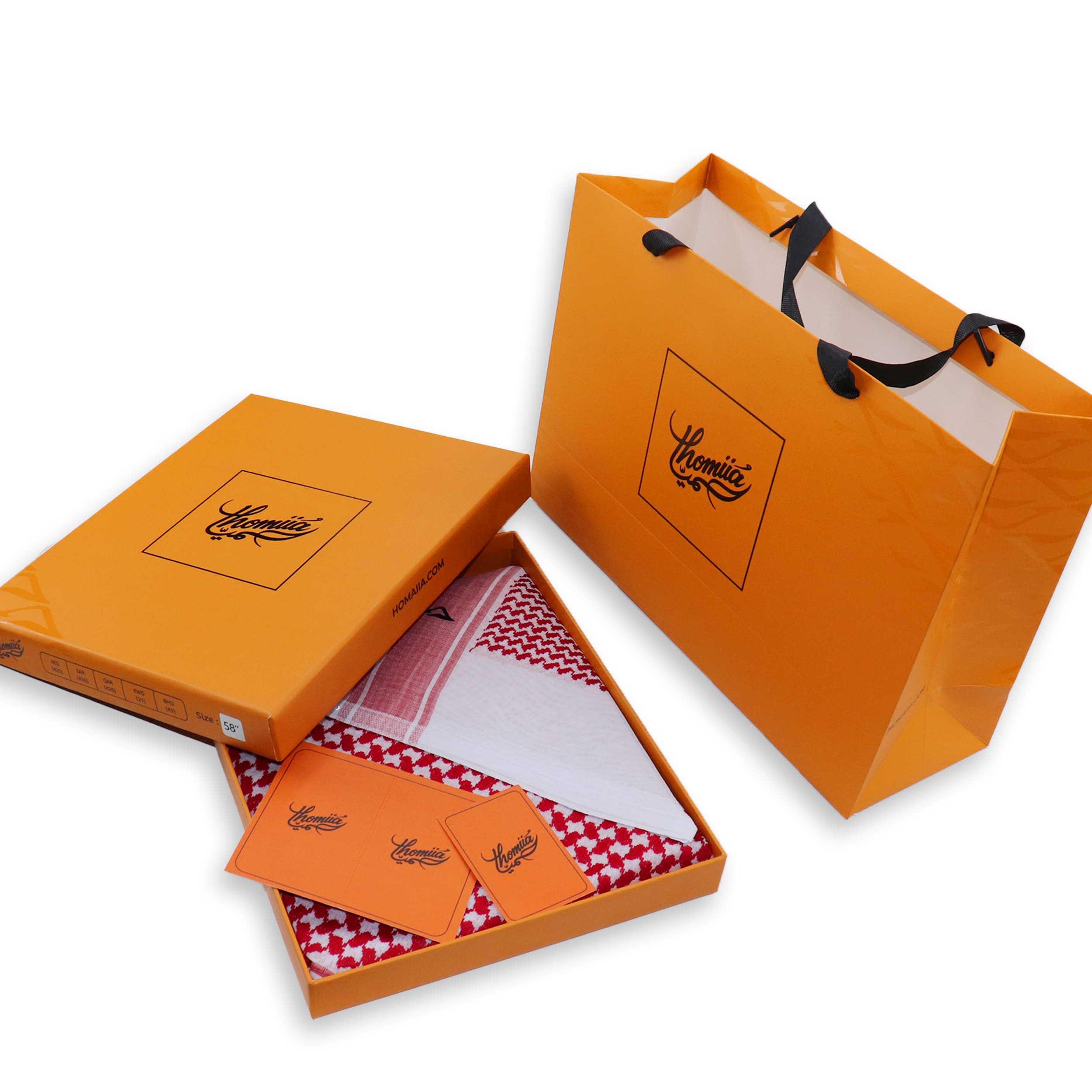 أكمل هديتك بأناقة مع كيس إهداء ماركة حميّا باللون البرتقالي المميز. يتميز بتصميم فاخر يحمل شعار الماركة باللون الأسود، مع خامة متينة ولمعة أنيقة تضفي لمسة راقية. يأتي مزودًا بمقابض سوداء قوية وعملية لسهولة الحمل، مما يجعله الخيار المثالي لتقديم الشماغ، الغترة أو القماش